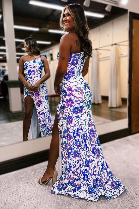 Sparkly Sequin Tulle One Shoulder Sexy High Slit Prom Dresses ,Prom outfits SH427