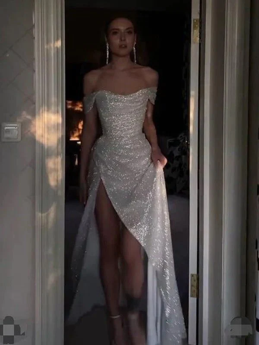 Sparkly Sequins Off Shoulder Side Slit Prom Dress P1496