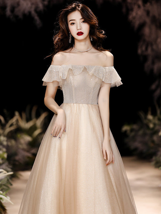 Soft Pink A-line off-shoulder tulle sequins beaded long prom dress, pink evening dress ED01033
