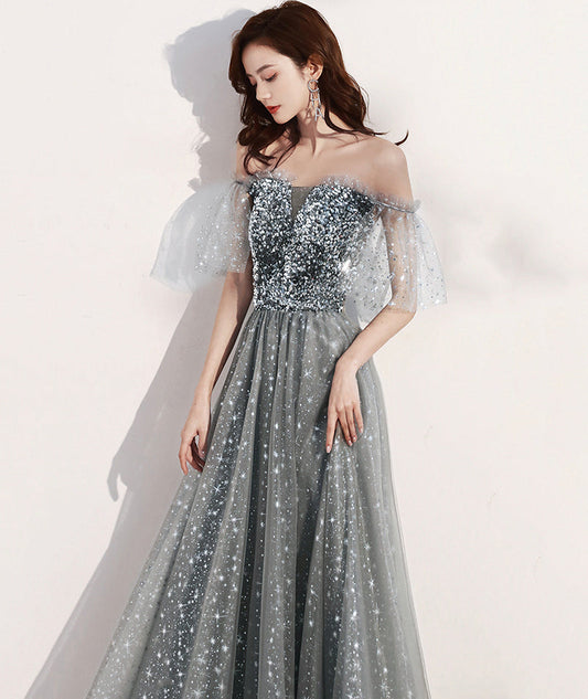 Shiny tulle long prom dress with sequins gray evening dress 8405