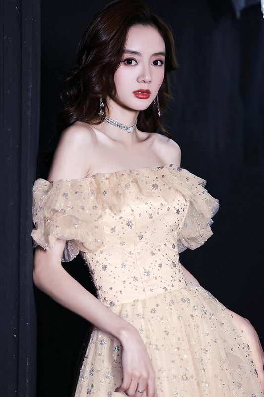 Shiny tulle sequins long prom dress A-line evening dress fg965