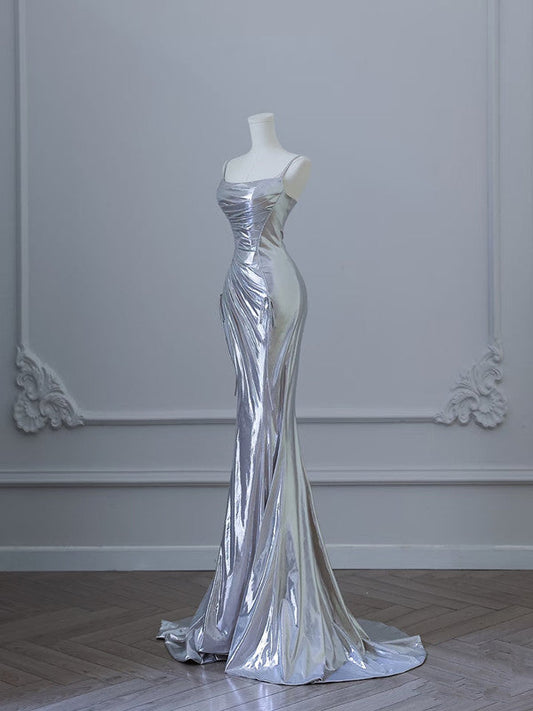 Sexy Mermaid Spaghetti Straps Sequin Silver Evening Gowns Long Prom Dresses SD1822