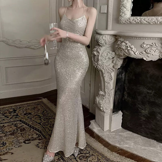 Sexy Mermaid Spaghetti Straps Sequin Backless Floor Length Evening Dress Prom Dresses SD1705