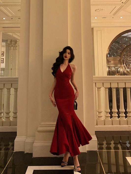Sexy Mermaid Halter Red Sequin Sleeveless Prom Dresses Party Dress Summer Birthday Outfits 20th Birthday Dresses W818