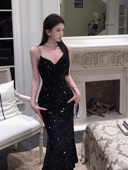 Sexy Mermaid Spaghetti Straps Black Sequin Prom Dresses Birthday Outfits SD607