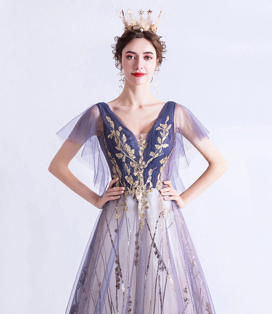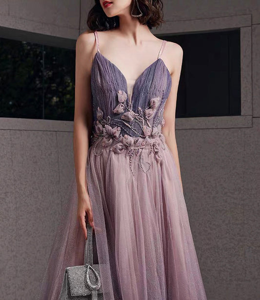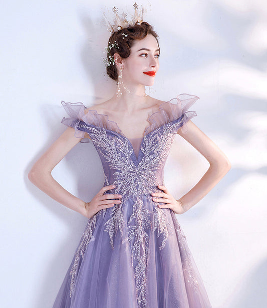 Purple v neck tulle sequin long prom dress purple evening dress fg977