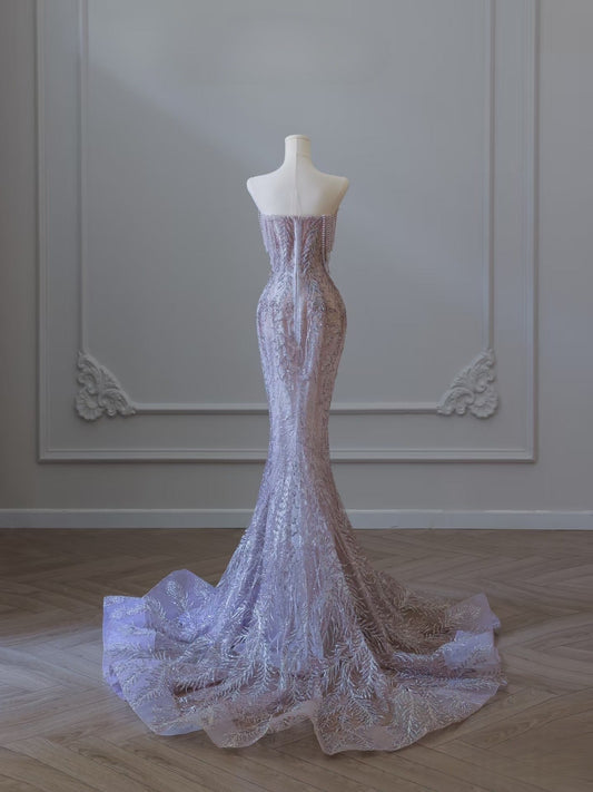 Pretty Mermaid Strapless Lilac Sequin Beads Long Prom Dresses Formal Evening Dress SD2334