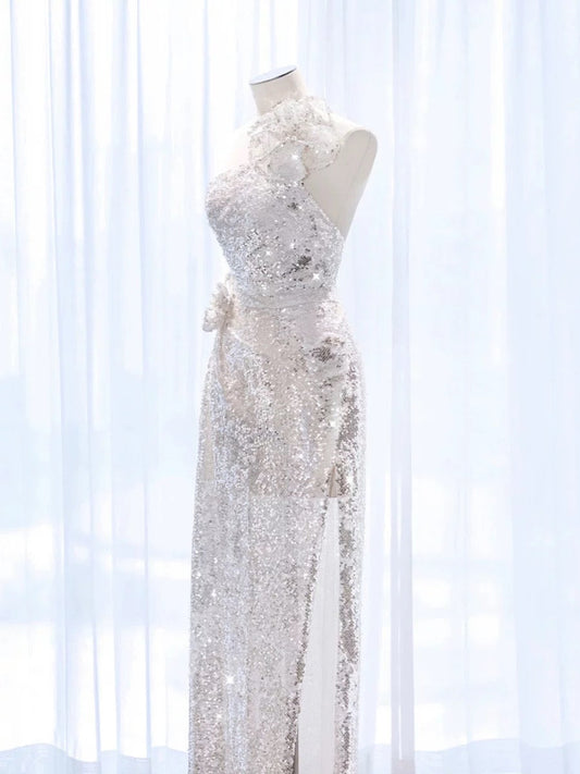 Pretty A Line One Shoulder Silver Sequin Long Length Evening Dress Prom Dresses SD2777