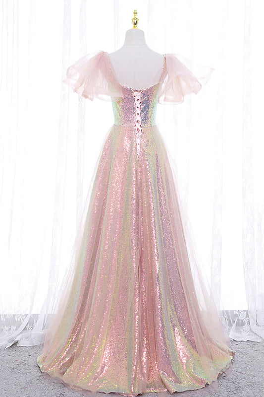 Pretty A Line Sweetheart Neck Sequin Pink Tulle Long Prom Dress Evening Dress SH3143