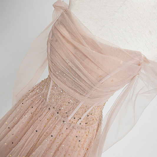 Pearl Pink Off Shoulder Long Sleeves Sequins Prom Dress, A-Line Party Dress Formal Dress gh228