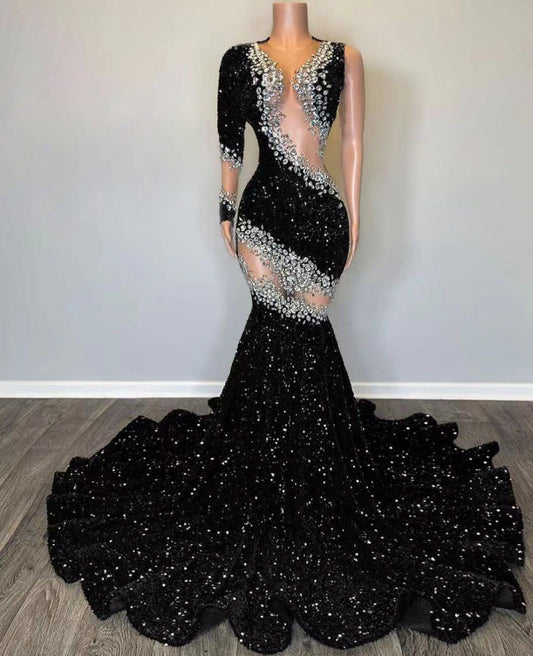 One Shoulder Prom Dresses, Diamond Prom Dresses, Black Sparkly Prom Dresses, Sequined Evening Dresses fg4383