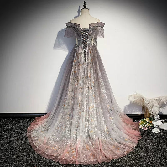 Off Shoulder Tulle Sequin Long Prom Dress Formal Quinceanera Dress Ball Gown SH1325