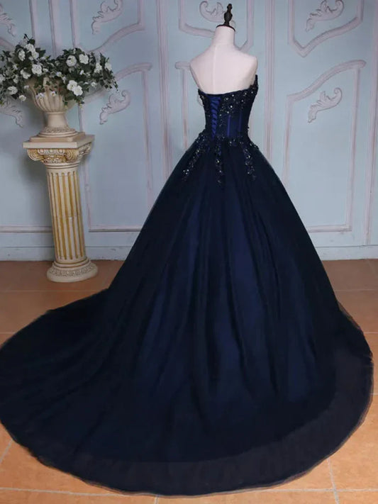 Navy Blue Strapless Sequins Tulle Long Prom Dresses Ball Gown SH1656
