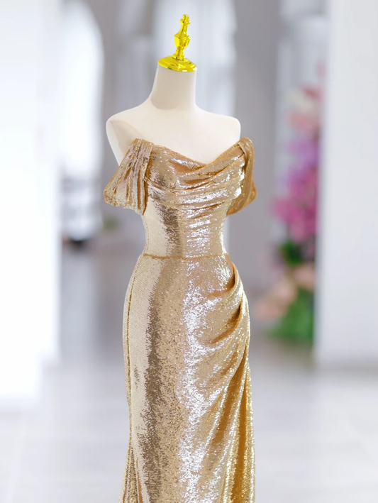 Modest Mermaid Off The Shoulder Gold Sequin Long Evening Party Gowns Evening Dress Special Formal Dresses Prom Dress DH2791