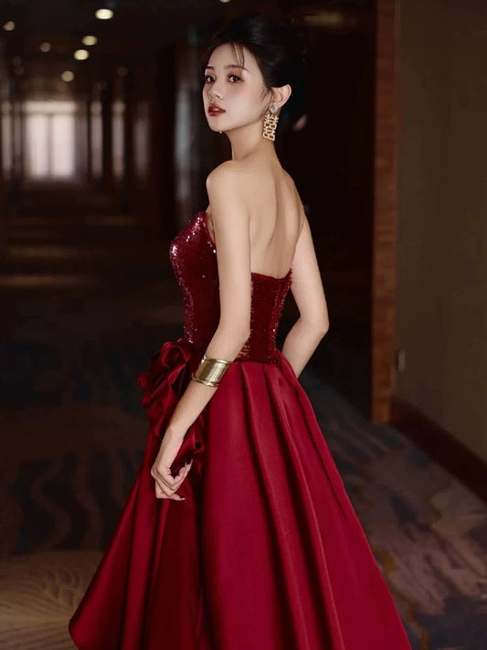 Modest Ball Gown Strapless Burgundy Sequin Sleeveless Long Evening Party Gowns Evening Dress Special Formal Dresses Prom Dress DH1369