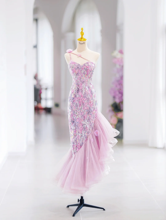 Modest Mermaid One Shoulder Pink Sequin Long Evening Party Gowns Evening Dress Special Formal Dresses Prom Dress DH2792