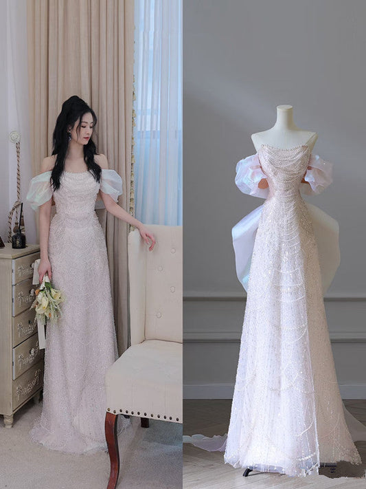 Modest A line Off The Shoulder Pink Sequin Long Floor Length Pearls Prom Dresses P2404