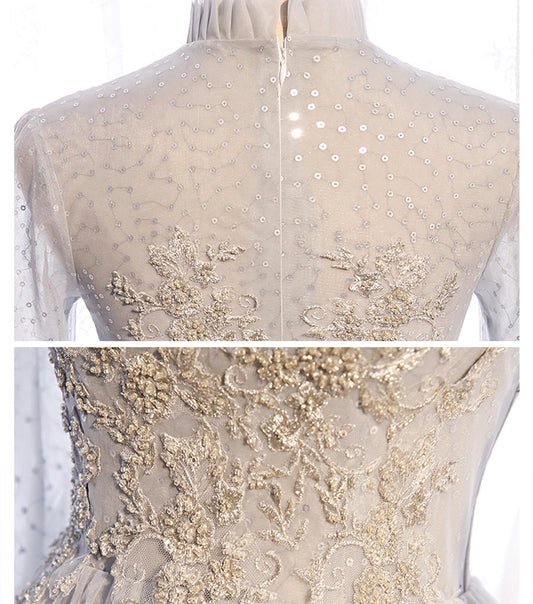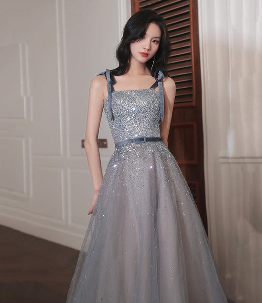 Gray Tulle Sequin Long Prom Dress, Gray Tulle Long Evening Dress ED0669