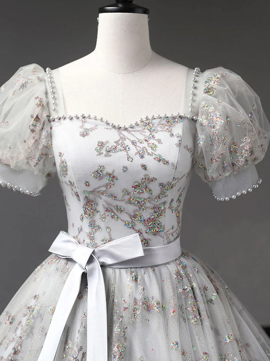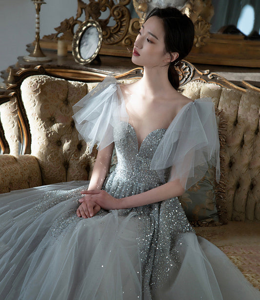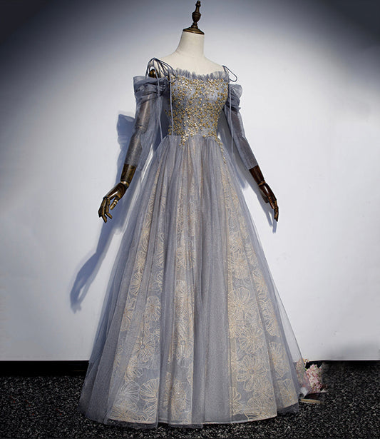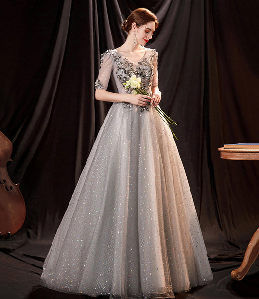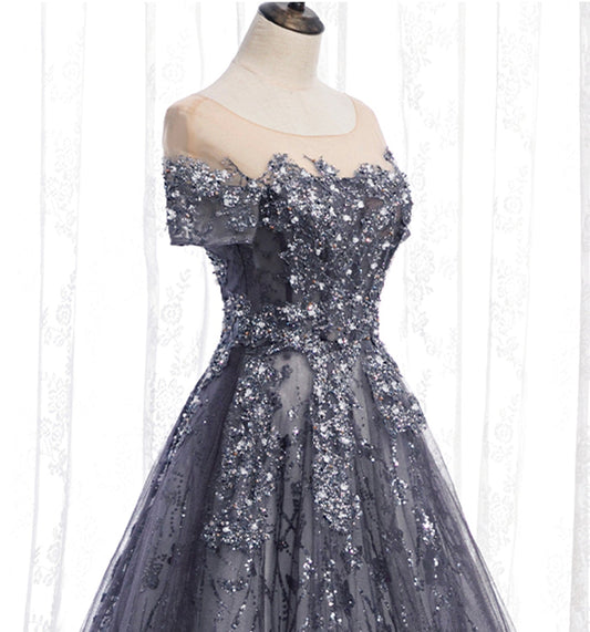 Gray A-Line Tulle Sequin Long Prom Dress, Gray Formal Evening Dresses ED0702