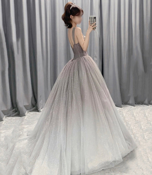 Gradient Purple A-Line Spaghetti Strap Tulle Sequin Long Prom Dresses for Birthday&Graduation ED01672