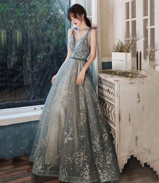 Gray Green Tulle Sequin Beads Long Prom Dress, Green Evening Dress gh2132