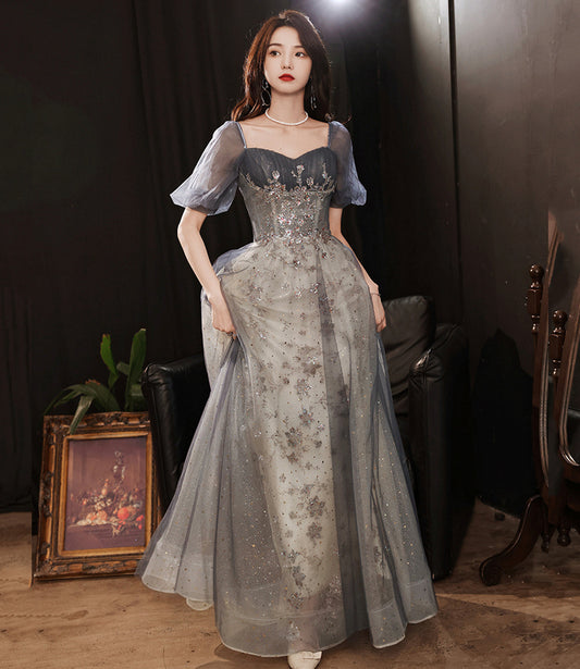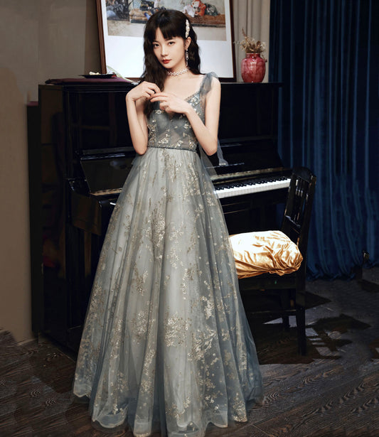 Gray Blue A-Line Tulle Sequins Long Prom Dress, Beautiful Gray Blue Evening Party Dress ED0997