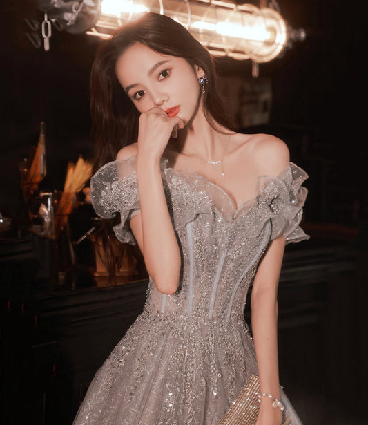 Gray tulle sequins A line prom dress gray evening dress 10433