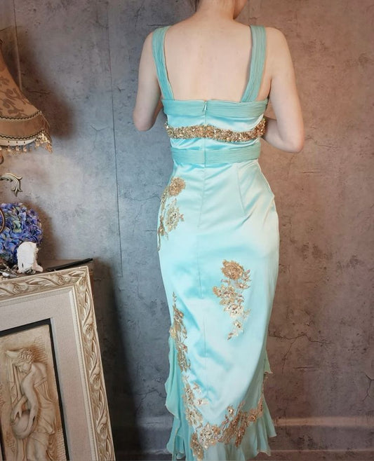 Gorgeous Sheath Strap Appliques Sequin Beaded Blue Satin Prom Dress Evening Dress SH2669