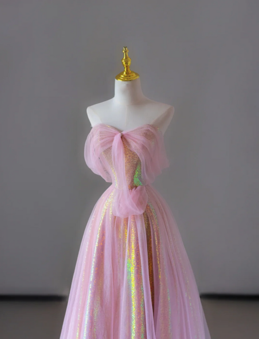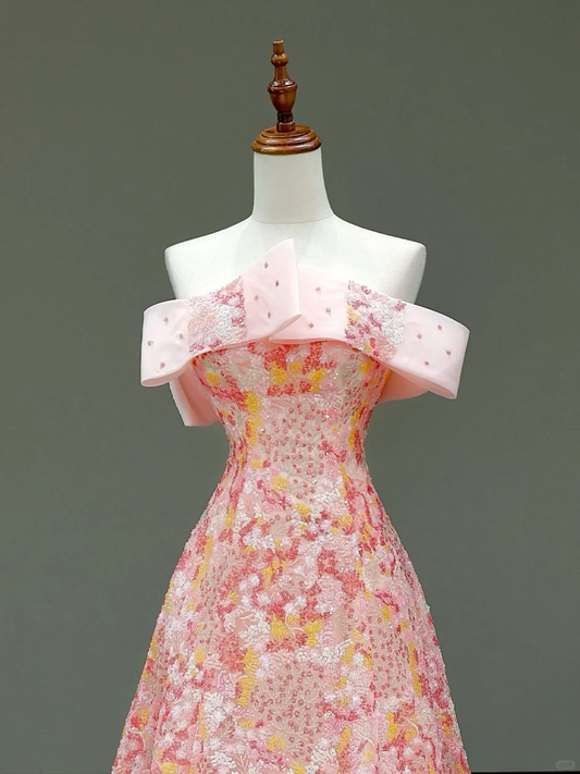 Gorgeous A line Off The Shoulder Pink Floral Sequin Beads Long Prom Dress Party Dress Graduation Dresses DP1869