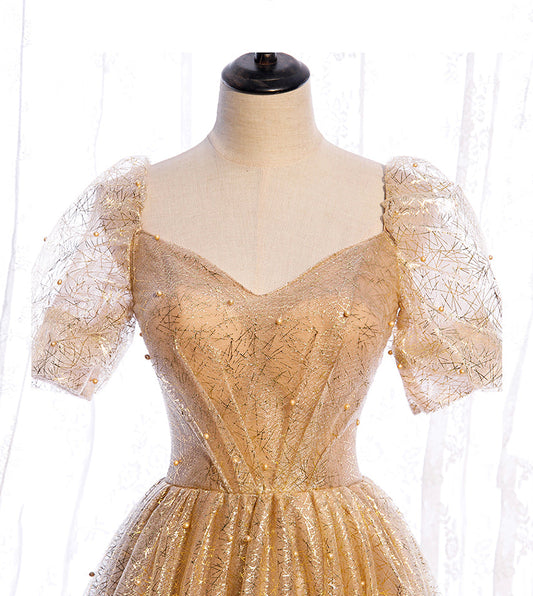 Golden A Line Sweetheart Neck Sequin Tulle Long Prom Dress Evening Dress SH2543