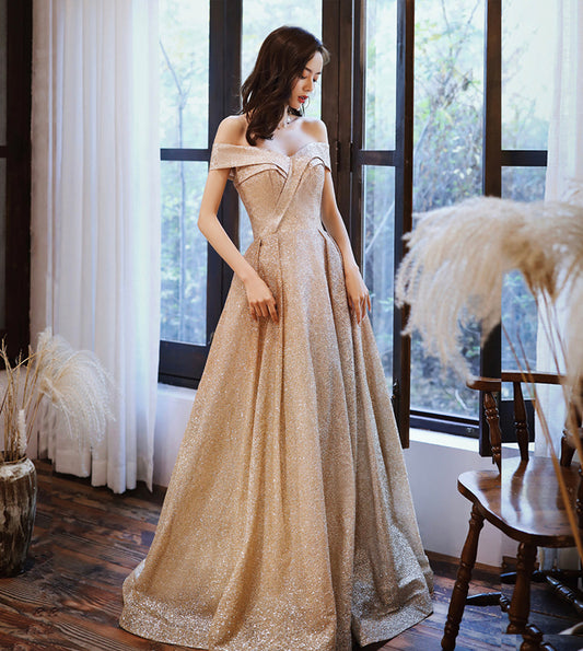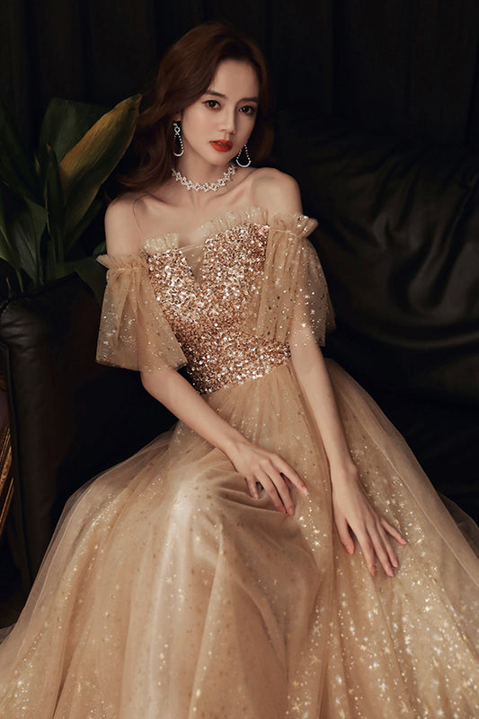 Gold A Line Off-the-shoulder Appliques Sequins Tulle Prom Dress SH1685