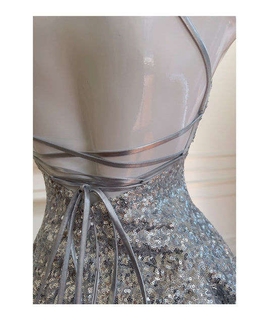 Glitter Silver Halter Neck A-Line Sequin Short Prom Dresses Formal Evening Gowns ED03214