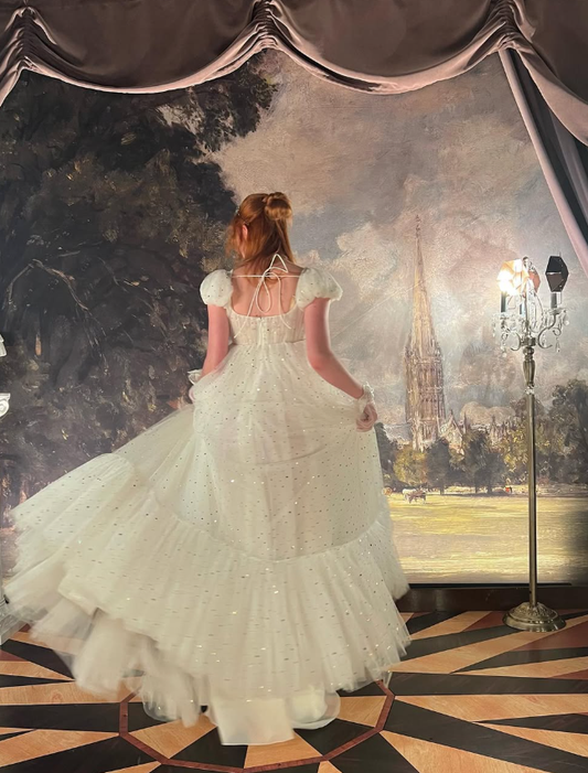 Flowy Gentle White A Line Puff Sequin Tulle Prom Dress Birthday Dress SH3714