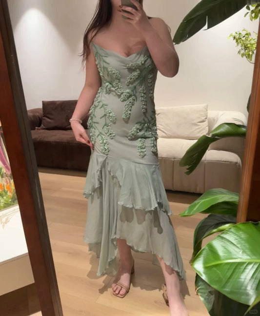 Fresh Green Beaded Sequined Chiffon Irregular Fishtail Prom Dress P3387