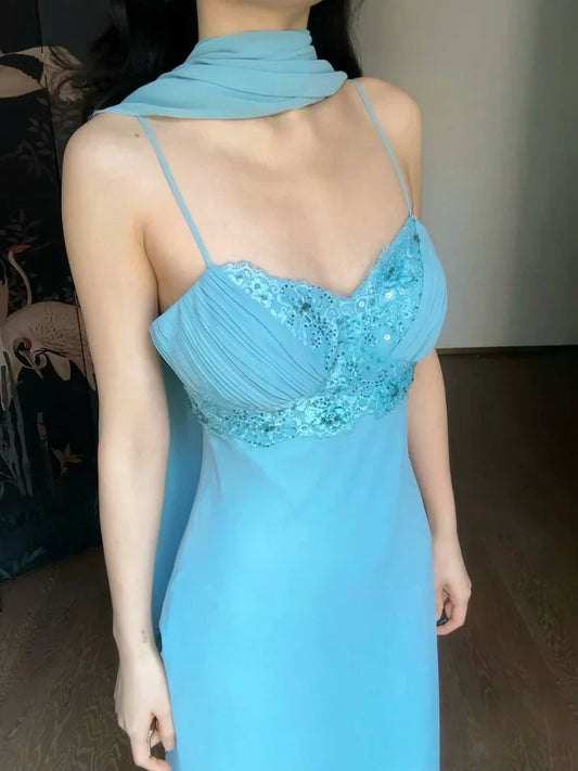 Elegant Sheath Spaghetti Strap Beaded Sequin Blue Chiffon Prom Dress Graduation Prom Dress SH2618