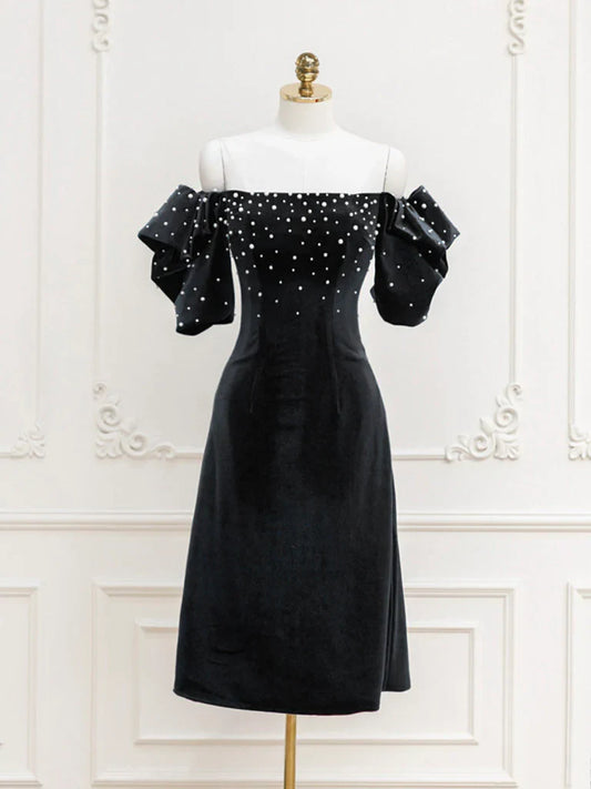 Black Velvet off-the-shoulder Beads Short Prom Dress, Black Evening Dress ED0649