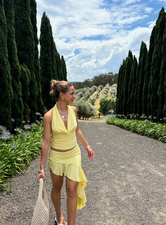 Yellow Two Piece A Line Halter Satin Open Back Short Homecoming Dress Cocktail Dress SH3385