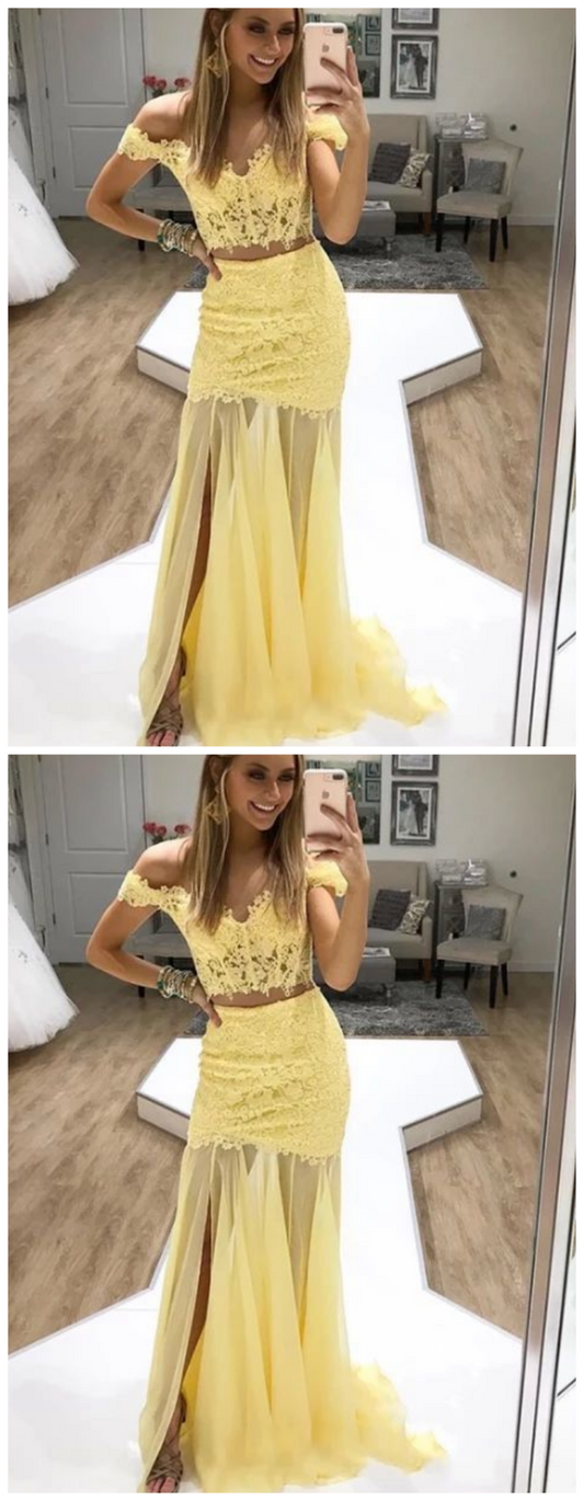 Yellow Two Pieces Lace Long Prom Dresses, Two Pieces Yellow Formal Dresses, Yellow Lace Evening Dresses P0996