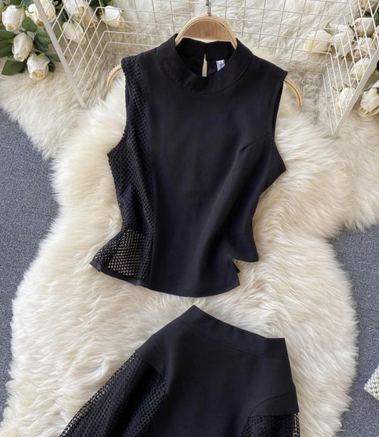 Black split vest skirt dress two piece set 2855