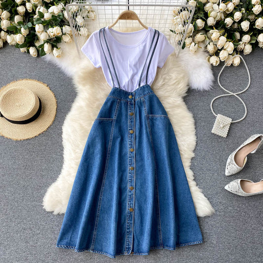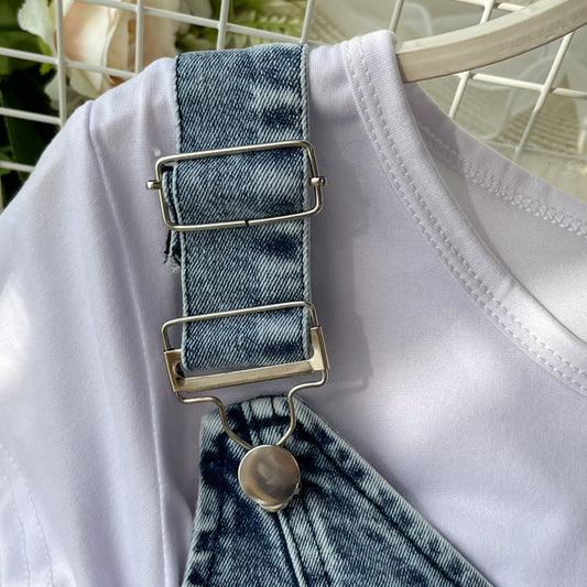 Irregular ruffled fishtail strap skirt denim dress two piece set 3064