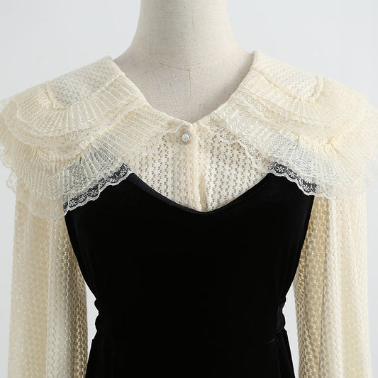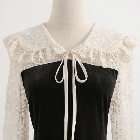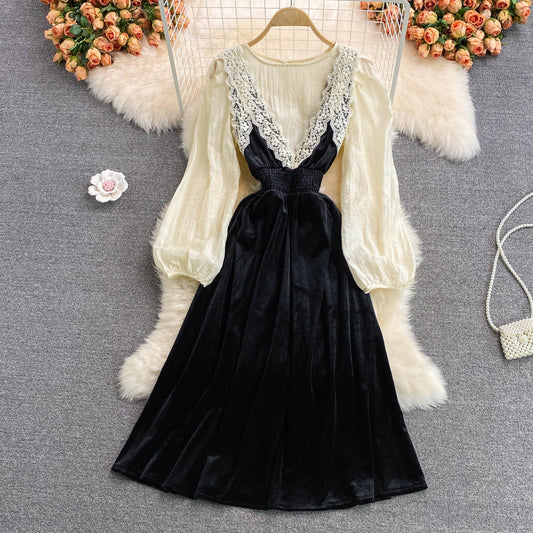Fake two piece lace skirt stitching velvet dress method 2282