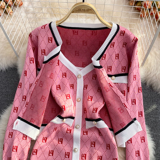Knitted cardigan two piece V-neck suspender dress 3260