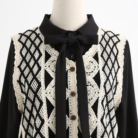 French retro net red two piece suit doll collar lace backed knitted dress 2465