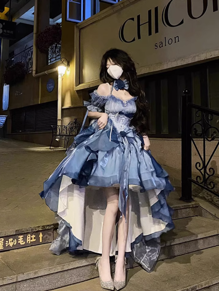Vintage High Low Off The Shoulder Short Sleeves 16th Blue Birthday Dress Lolita Dress Birthday Outfits DP0224
