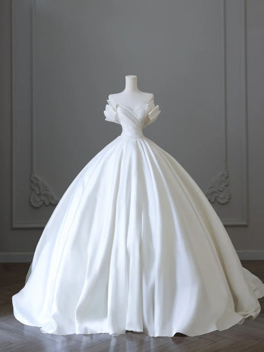Elegant and simple satin off-shoulder white floor-length wedding dress P2521