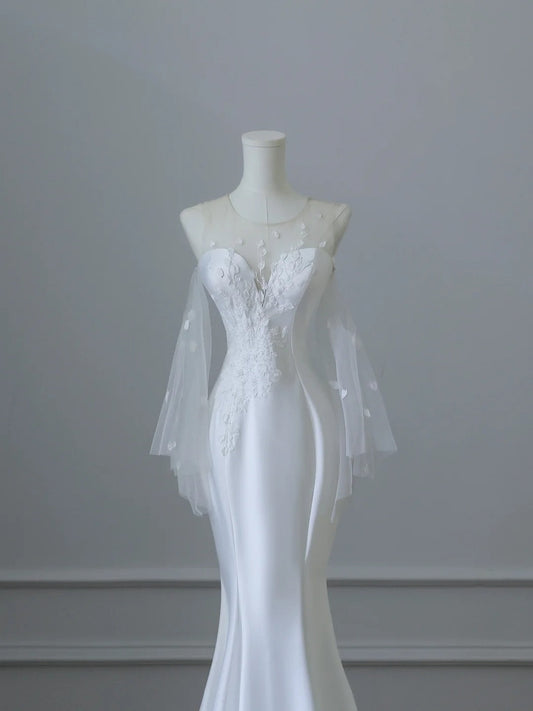 Elegant White Round Neck Lace Sleeveless Mermaid Satin Wedding Dress P2530