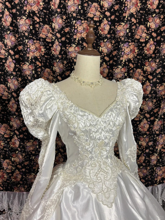 Vintage Leg of Mutton Sleeve V-Neck Pleated Ruffled Satin Floor-Length Wedding Dress P2992