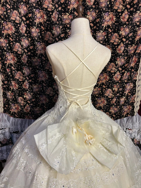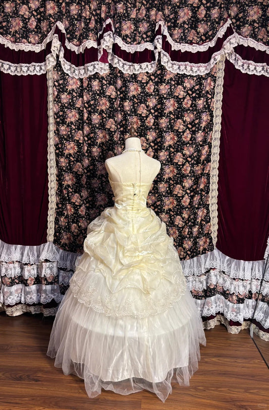 Cream Princess Tube Top Watery Satin Small Pearl Bow Puffy Wedding Dress P3036