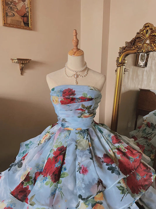 Glacier Blue Rose Print Lightweight Flowing Tulle Strapless Floor-Length Wedding Dress P3075