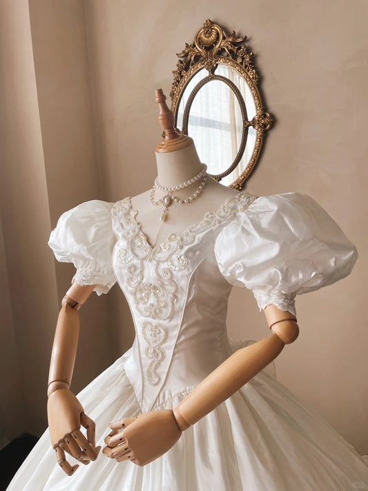 French Retro V-neck Beaded Puff Sleeve Satin Princess Wedding Dress P3076